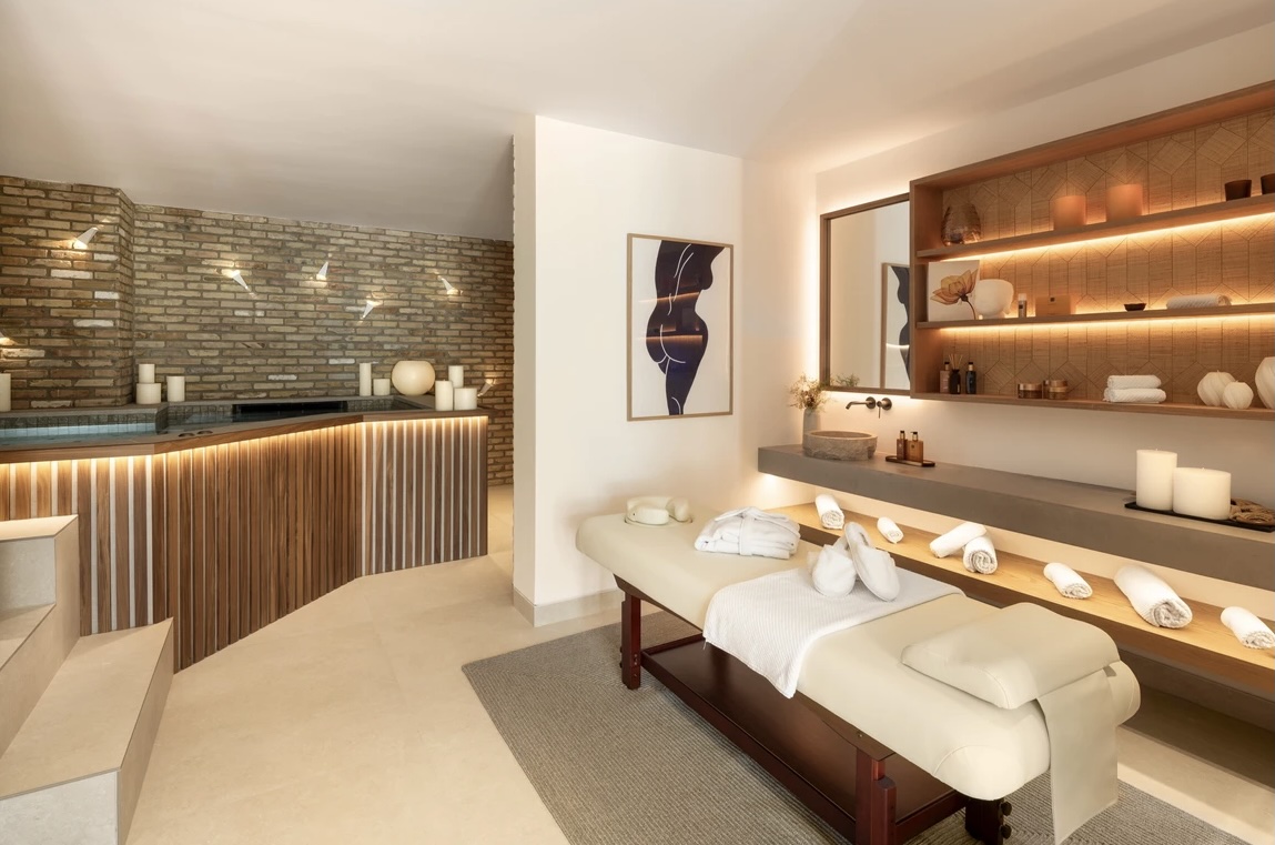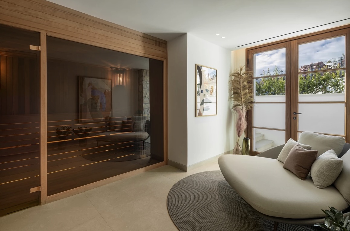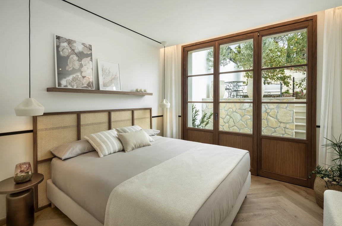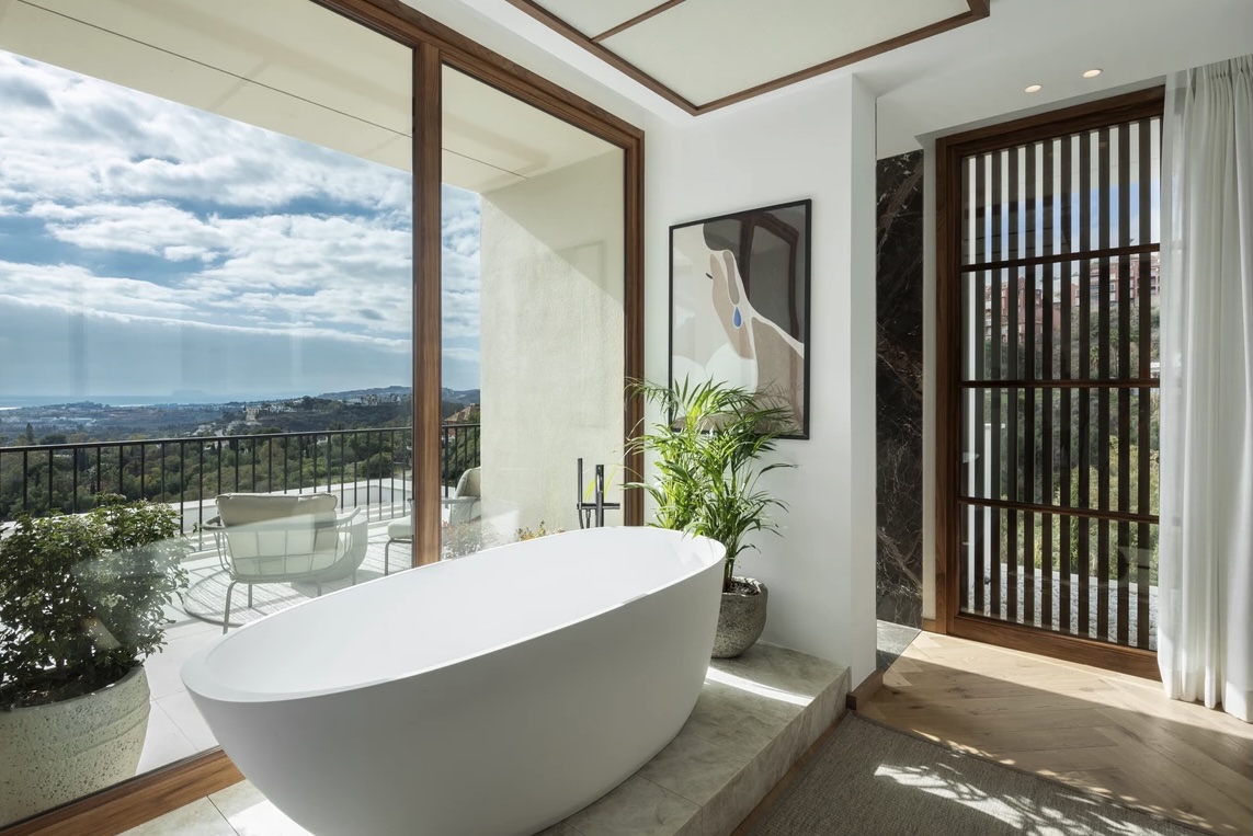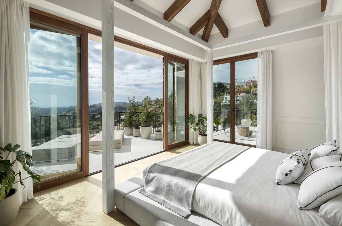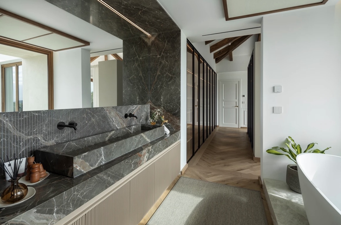 Of the villa’s five stunning bedrooms, the master suite is truly exceptional. Its ceiling, detailed with sophisticated wooden beams that echo the triangular shape of the roof, adds a traditional touch inspired by Spanish Hacienda architecture.