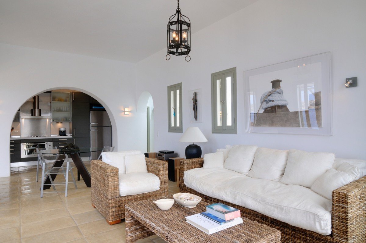 Inside, the decor is elegantly simple, allowing the stunning landscape to take prominence and creating a welcoming, serene atmosphere that feels like home. Every element, from the casually arranged island-themed decor to the rattan furniture radiating a relaxed charm, subtly reinforces the vacation vibe. The living areas are bright and airy, with expansive windows offering captivating views of the seascape and the dynamic hues of the evening sky.