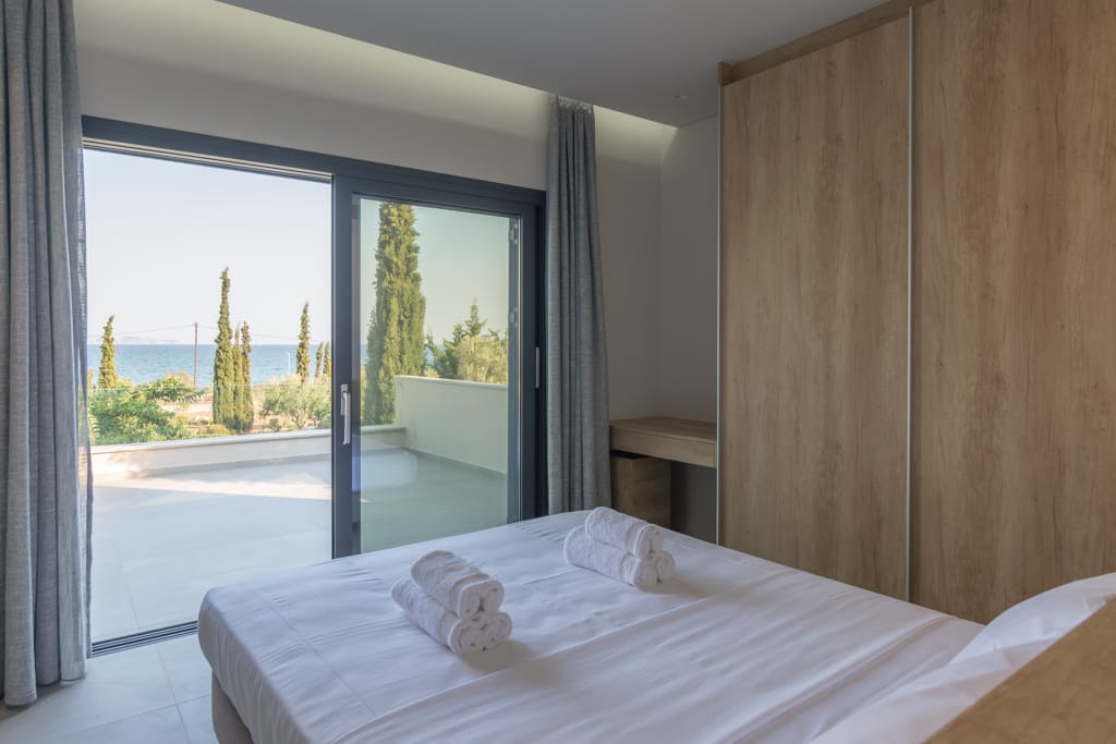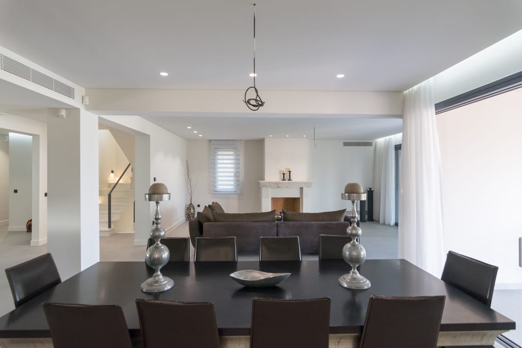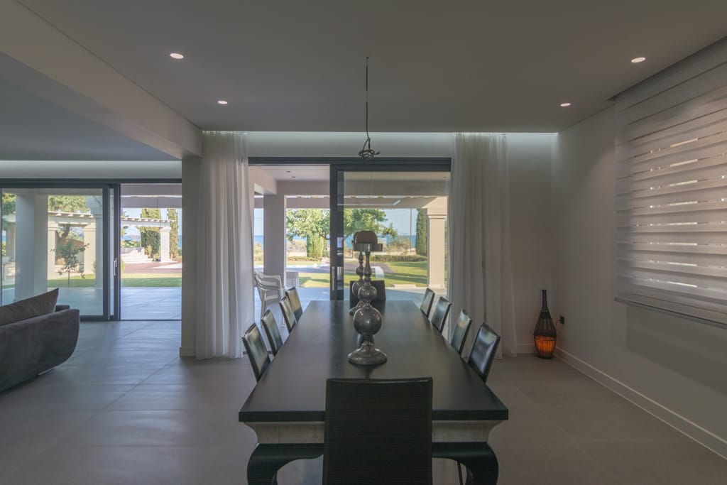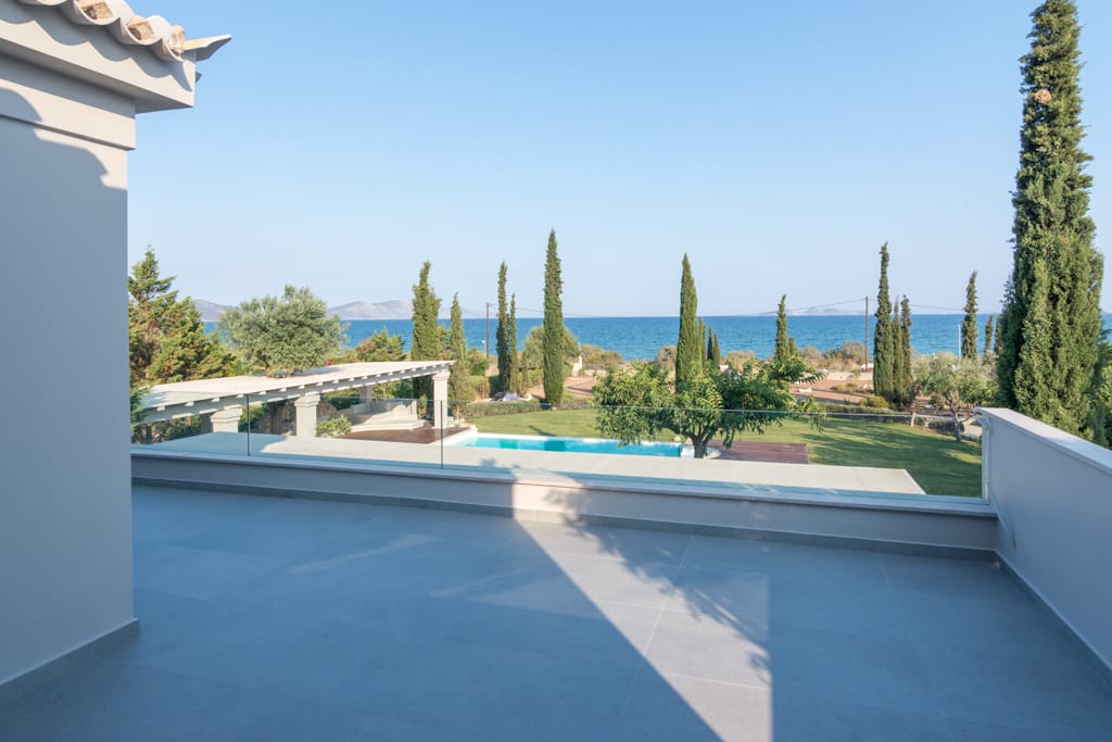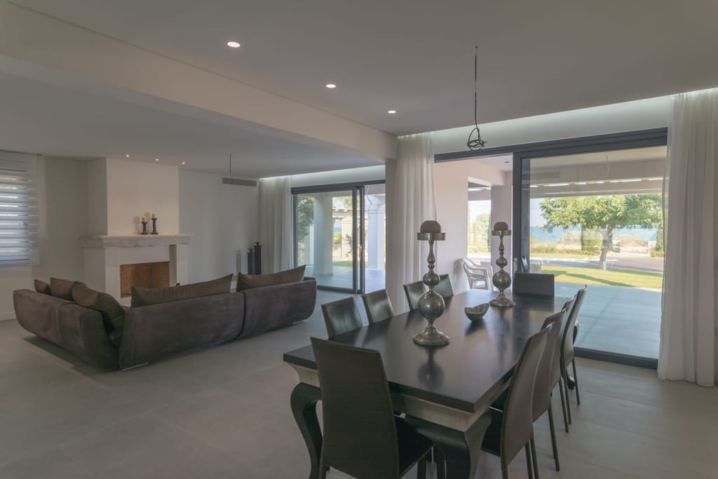 Perched in a prime location, the villa offers breathtaking views of the sea, with vistas stretching across the waters between the islands of Spetses and Hydra. Inside, the spacious living and dining areas are bathed in natural light, thanks to the large windows that also provide seamless access to the wide balconies designed to maximize outdoor living and the stunning views.