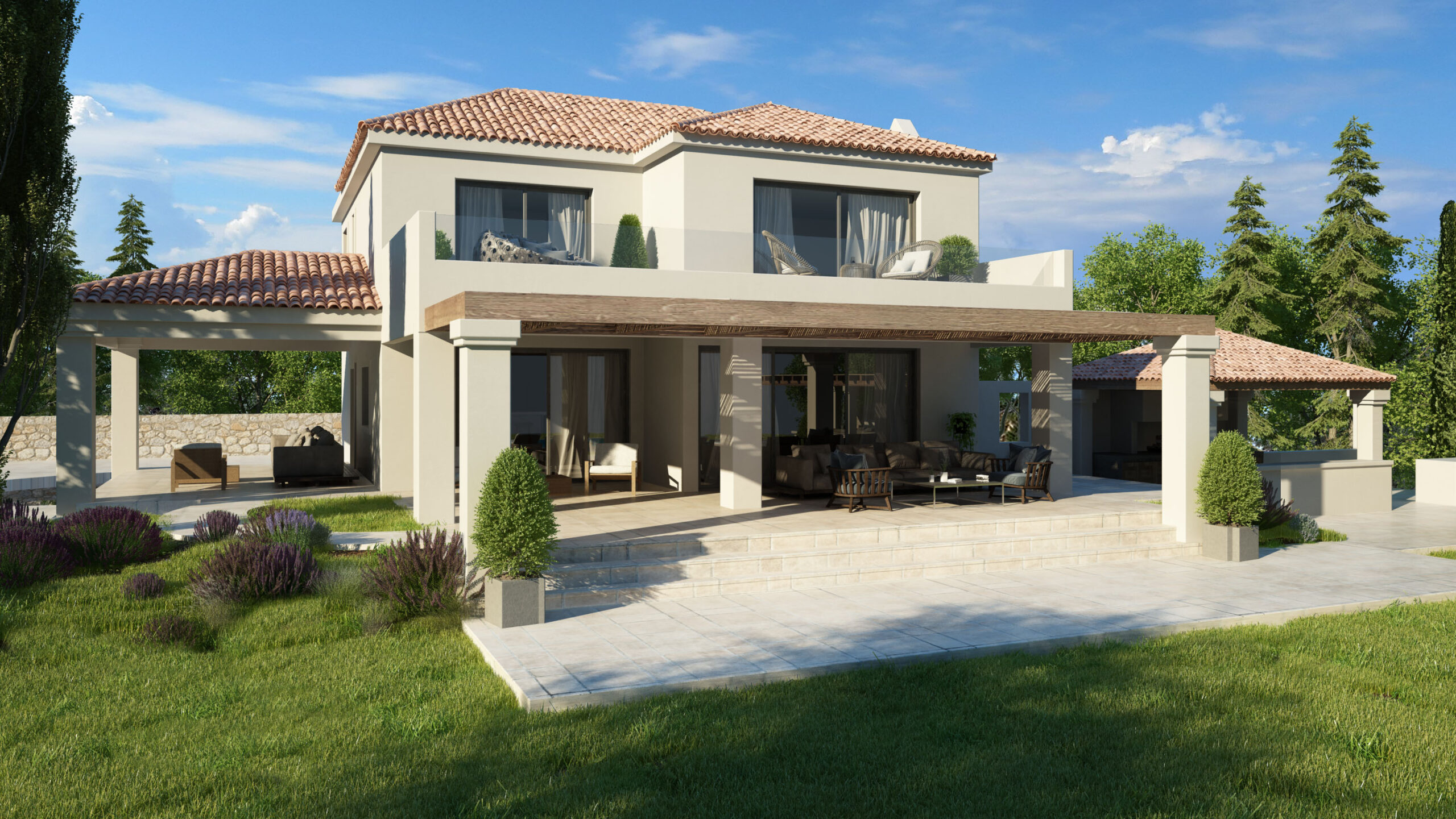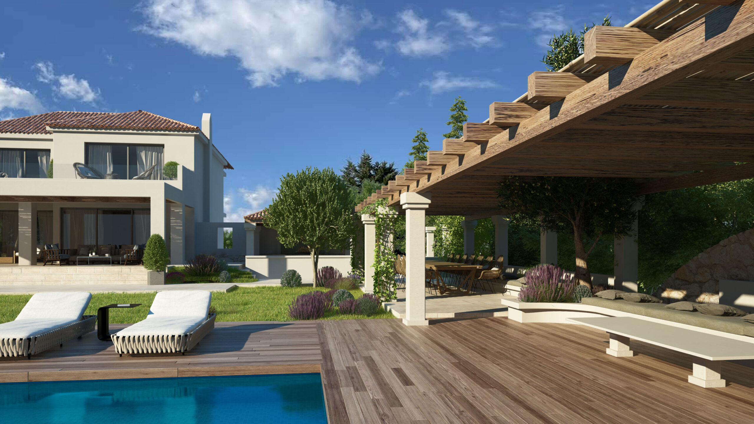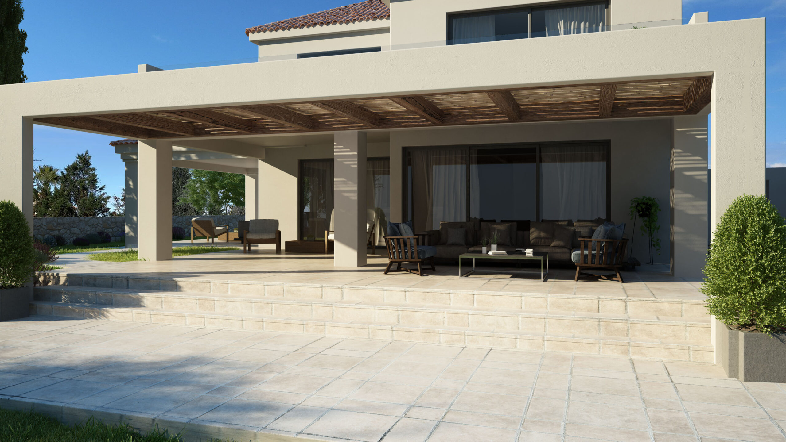 The meticulously manicured garden and inviting patios create an ideal setting for relaxation and gatherings, perfectly complementing the villa’s sophisticated interiors.